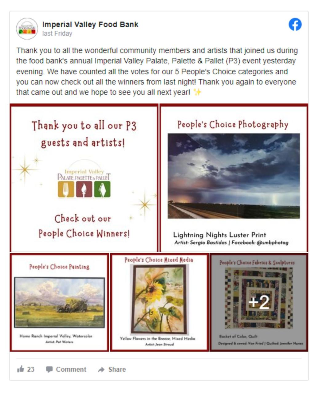 The fundraiser event named for the three Ps, included an abundance of snacks and appetizers for guests’ palates, artwork to browse of various palettes and the funds raised overall will be put toward purchasing pallets of food for people in need in the Imperial Valley.