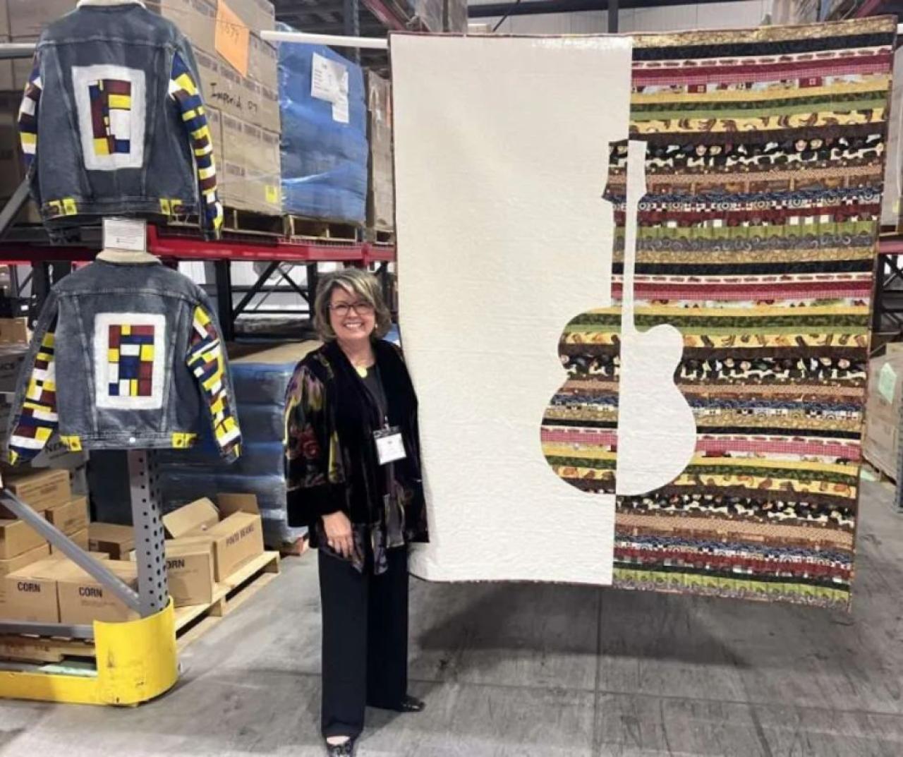 “Every piece of work tells a story,” she said while talking about one of her displayed quilt pieces. “My style of quilting includes abstract style,” Gillinat mentioned while talking about a half-and-half split design on a quilt with a large Gibson guitar shape.