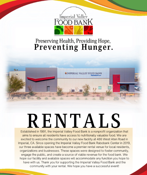 Check out our rental information below and should you need more information, please contact Office Manager Kandy Pereira at 760-370-0966 or kandy@ivfoodbank.com for additional information, availability options and to submit your rental agreement.