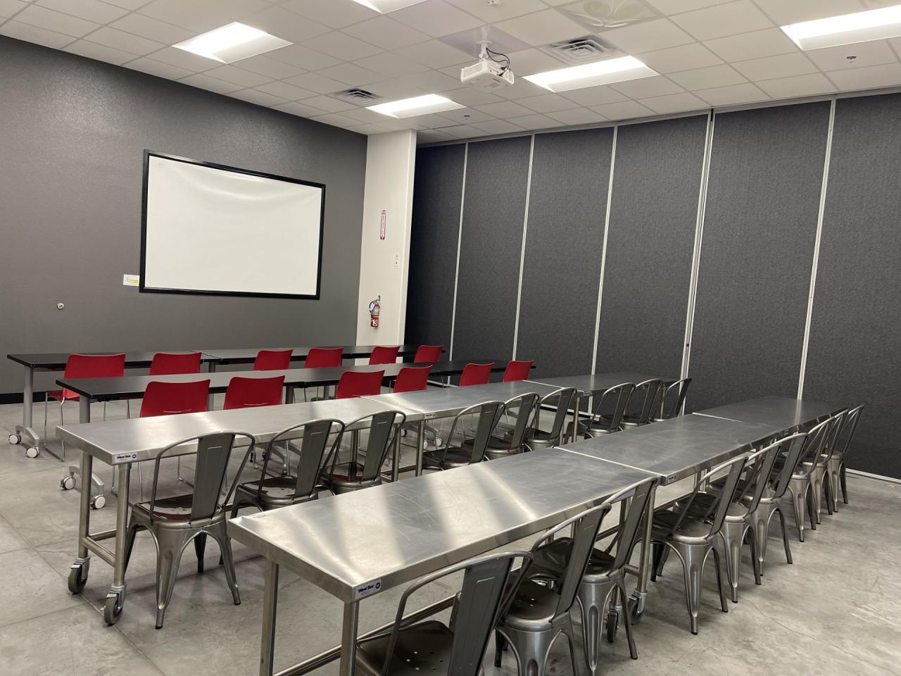 Tables and chairs for all areas are included in each rental. Room seats 40 people and includes projector, lavalier microphone, teaching camera, & TV/Camera display. Best for vendors or instructional cooking classes.
