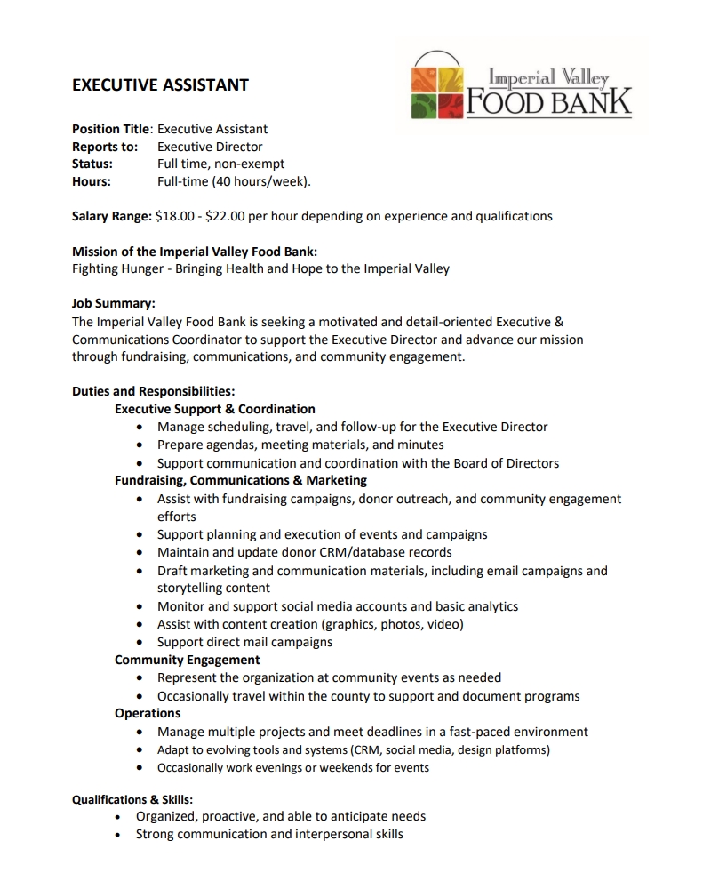 Imperial Valley Food Bank is proud to cultivate a dynamic and diverse work environment - one that plays a critical role in our ambitious work to fight hunger and bring health and hope to the Imperial Valley. We recruit and retain insightful employees who have backgrounds and skills from across the professional spectrum and join our organization because they want to make a real difference in the lives of our community.